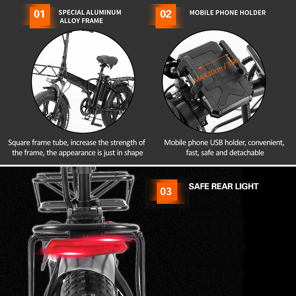 Configuration : le cadre en alliage d'aluminium est léger et solide, et la charge de sécurité de ce vélo est jusqu'à 100 kg. Le système de frein à disque avant et arrière réduit efficacement la distance de freinage. Les gros pneus de 20 * 4,0 pouces rendent le cyclisme plus stable pour s'adapter à toutes les conditions de route telles que la neige, la route, la plage et la route de montagne.